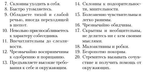 Количество совпадающих с ключом ответов умножается на значение коэффициента соответствующего типа акцентуации. Если полученный результат превышает 18, то это свидетельствует о выраженности данного типа акцентуации. При этом, полученному результату можно доверять, если по позиции «ложь» вы набрали не более 5 баллов. Ниже приводятся поведенческие характеристики основных типов акцентуации характера. 1. Гипертимный тип. Отличается повышенным настроением, оптимистичен, чрезвычайно контактен, быстро переключается с одного дела на другое. Не доводит начатое дело до конца, недисциплинирован, склонен к аморальным поступкам, необязателен, самооценка завышена. Конфликтен, часто выступает инициатором конфликтов. 2. Дистимный тип. Противоположен гипертимному типу. Отличается пессимистическим настроением, неконтактен, предпочитает одиночество, ведет замкнутый образ жизни, склонен к занижению самооценки. Редко вступает в конфликты с окружающими. Высоко ценит дружбу, справедливость. 3. Циклоидный тип. Отличается довольно частыми периодическими сменами настроения. В период подъема настроения поведение гипертимно, а в период спада – дистимно. Самооценка неустойчива. Конфликтен, особенно в период подъема настроения. В конфликте непредсказуем. 4. Возбудимый тип. Отличается низкой контактностью в общении. Занудлив, угрюм, склонен к хамству и брани. Неуживчив в коллективе, властен в семье. В эмоционально спокойном состоянии добросовестен, аккуратен. В состоянии эмоционального возбуждения вспыльчив, плохо контролирует свое поведение. Конфликтен, часто выступает инициатором конфликтов, в конфликте активен. 5. Застревающий тип. Отличается умеренной общительностью, занудлив, склонен к нравоучениям, часто занимает позицию «Родителя». Стремится к высоким показателям в любом деле, предъявляет повышенные требования к себе, чувствителен к социальной справедливости. Обидчив, уязвим, подозрителен, мстителен, ревнив. Самооценка неадекватна. Конфликтен, обычно выступает инициатором конфликтов, в конфликте активен. 6. Педантичный тип. Отличается добросовестностью, аккуратностью, серьезностью в делах. В служебных отношениях – бюрократ, формалист, легко уступает лидерство другим. В конфликты вступает редко. Однако его формализм может провоцировать конфликтные ситуации. В конфликте ведет себя пассивно. 7. Тревожный тип. Отличается низкой контактностью, неуверенностью в себе, минорным настроением. Самооценка занижена. Вместе с тем для него характерны такие черты, как дружелюбие, самокритичность, исполнительность. Редко вступает в конфликты, играя в них пассивную роль, преобладающие стратегии поведения в конфликте – уход и уступка. 8. Эмотивный тип. Отличается стремлением к общению в узком кругу. Устанавливает хорошие контакты только с небольшим избранным кругом людей. Чрезмерно чувствителен. Слезлив. Вместе с тем для него характерны доброта, сострадательность, обостренное чувство долга, исполнительность. Редко вступает в конфликты. В конфликтах играет пассивную роль, склонен к уступкам. 9. Демонстративный тип. Отличается легкостью установления контактов, стремлением к лидерству, жаждой власти и славы. Склонен к интригам. Обходителен, артистичен. Вместе с тем люди данного типа эгоистичны, лицемерны, хвастливы. Конфликтен. В конфликте активен.
