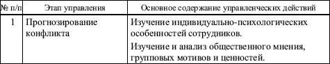 В реальной практике по управлению конфликтами важно учитывать предпосылки, формы и способы их разрешения. Предпосылки разрешения конфликта: • достаточная зрелость конфликта; • потребность субъектов конфликта в его разрешении; • наличие необходимых средств и ресурсов для разрешения конфликта. Формы разрешения: • уничтожение или полное подчинение одной из сторон (уступка); • согласование интересов и позиций конфликтующих сторон на новой основе (компромисс, консенсус); • взаимное примирение конфликтующих сторон (уход); • перевод борьбы в русло сотрудничества по совместному преодолению противоречий (сотрудничество). Способы разрешения: • административный (увольнение, перевод на другую работу, решение суда и т. п.); • педагогический (беседа, убеждение, просьба, разъяснение и т. п.). Алгоритм деятельности руководителя в процессе управления конфликтами Алгоритм деятельности руководителя в процессе управления конфликтами зависит от многих факторов – содержания самого конфликта, условий его возникновения и развития и многих других. Поэтому универсальный алгоритм деятельности руководителя по управлению конфликтами предложить невозможно. Но какие-то основные, целесообразные шаги в таком алгоритме можно выделить. Их мы представим в табл. 4.3. В процессе управленческой деятельности по разрешению конфликтов и в выборе алгоритма такой деятельности для руководителя важно учитывать следующие принципы управления конфликтами: • объективности и адекватности оценки конфликта; • конкретно-ситуационного подхода; • гласности; • демократического воздействия, опоры на общественное мнение; • комплексного использования способов и приемов воздействия. Таблица 4.3 Алгоритм управления конфликтом