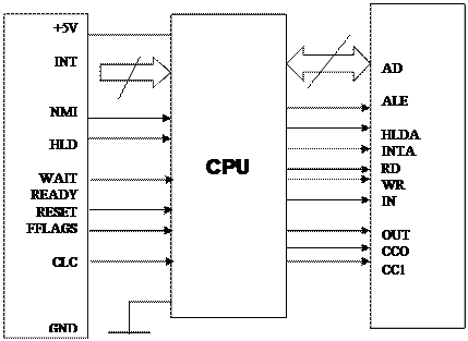 Процессор имеет совмещенную шину адреса и данных (AD). Сигнал ALE используется для фиксации адреса на внешнем регистре-защелке. Пара сигналов HLD и HLDA используется для реализации механизма захвата шины. Сигнал INT является сигналом запроса прерывания. Сигнал NMI – запрос немаскируемого прерывания. Линии RD(чтение), WR(запись), IN(ввод), OUT(вывод), задают выполняемую на шине операцию. Сигналы CC0, CC1, Wait используются для взаимодействия с сопроцессором. Линии CC0, CC1 служат для синхронизации работы с мат сопроцессором.