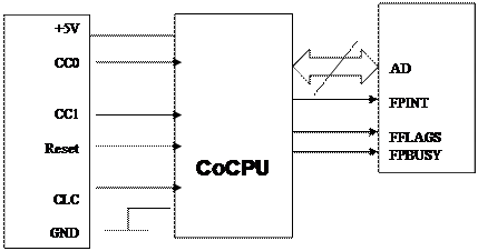 В сопроцессоре на вывод FPBUSY подается единичный сигнал указывающий на то, что сопроцессор занят. По линии FPINT выдается сигнал прирывания в случае ошибки. Назначение остальных выводов такое же как и у ЦП.