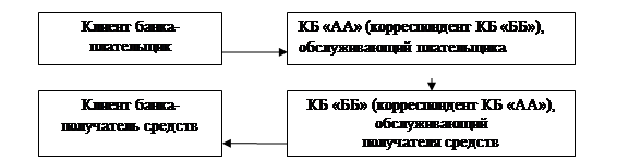 Рисунок 2. Схема документооборота при прямых корреспондентских отношениях между коммерческими банками России Корреспондентские отношения обычно сопровождаются открытием счетов (отношения со счетом) на взаимной основе (друг у друга) или в одностороннем порядке (только у одного из партнеров, как правило, у крупного банка). Выбор в пользу взаимных или односторонних корреспондентских отношений зависит от различных факторов, к которым следует отнести такие: объем взаимных потоков платежей, иена и спрос на рынке кредитных ресурсов, возможность участия в торгах на региональных валютных биржах, а также возможность оперативного отзыва находящихся на корреспондентских счетах средств. Возможно установление отношений между корреспондентами без открытия счета, когда взаимные расчеты осуществляются по счетам, открытым ими в третьем кредитном учреждении. Частный случай такой структуры договорных связей — расчеты через корреспондентские счета, открытые в подразделениях банков. Однако они могут проводиться и через счета, открываемые в каком-либо коммерческом банке, обычно являющемся крупным центром межбанковских расчетов. Установление корреспондентских отношений оформляется обменными письмами или заключением корреспондентского договора, в которых предусматриваются порядок и условия выполнения соответствующих банковских операций. Для этого банки представляют друг другу следующие документы, необходимые для изучения надежности и состоятельности партнеров: - нотариально заверенные копии уставов и лицензий на проведение различных операций; - отчеты о деятельности, включая балансы; - справки о соблюдении экономических нормативов и др. На основании заключенного межбанковского соглашения банки открывают корреспондентские счета. Счет одного банка в другом имеет два разных названия в зависимости от того, идет ли речь с точки зрения банка, предоставляющего услугу по счету, или же банка, пользующегося услугой по счету. Допустим, банк «АА» пользуется услугой другого банка по счету и является владельцем средств на этом счете. Банк «ББ» предоставляет услугу по счету и является банком, в котором открыт этот счет. Для банка «АА» счет будет называться счетом НОСТРО, а сам банк «АА» — банком-респондентом. Для банка «ББ» счет будет называться счетом ЛОРО, а сам банк «ББ» будет именоваться банком-корреспондентом. Банк-респондент является владельцем средств на счете НОСТРО и может самостоятельно распоряжаться ими. Банк-корреспондент является лишь администратором платежных поручений банка-респондента, однако ему принадлежит право устанавливать условия использования счета НОСТРО. К примеру, банк-корреспондент определяет уровень предоставляемого им обслуживания, включая своевременность и точность обработки зачисления и снятия средств со счета. Он также устанавливает расценки на комиссионные сборы за предоставляемые им платежные услуги и может ввести требование о минимальном уровне остатков. И наконец, самое главное состоит в том, что банк-корреспондент осуществляет контроль размеров предоставляемого банку-респонденту кредита по счету, ограничивая при этом объем разрешенных им овердрафтов. Договором могут устанавливаться как односторонние, так и взаимные корреспондентские отношения. В первом случае банк-корреспондент отк