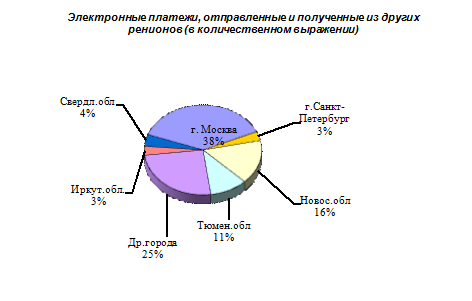 В 2009 году к системе БЭСП планируют подключиться 10 КО (филиалов), в т.ч. в качестве ПУР – 6, в качестве АУР – 4. При этом остальные (23) КО (филиалы) не планируют в ближайшее время участвовать в системе БЭСП в основном по 2 причинам: негативное влияние кризиса и отсутствие решения о подключении к системе БЭСП головных офисов филиалов иногородних КО. Межрегиональные электронные платежи (МЭП) через платежную систему Банка России осуществляются с 78-ю регионами (таблица 4 - 10 ). В сравнении с прошлым годом их количество увеличилось на 3,8% и составило 2965 тысяч платежей по начальному и ответному проводу. При этом сумма платежей увеличилась на 15% и составила 1262 млрд. рублей. Наиболее значительные объемы на протяжении нескольких лет занимают расчеты с Москвой. За 2008 год платежный оборот с Москвой составил 69% всех электронных расчетов (или 877 млрд. руб.). Следующими по сумме платежей являются регионы: Новосибирская, Тюменская области и г.Санкт-Петербург. Таблица 4. Платежный оборот с другими регионами по системе межрегиональных электронных платежей