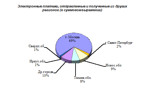 Структура электронного межрегионального платежного оборота по сравнению с прошлым годом по количеству платежей практически не изменилась (рис. 4 ). Однако по их сумме снизилась доля Москвы (с 77% до 69%), с одновременным увеличением доли МЭП с Новосибирской областью (с 5 до 9%).