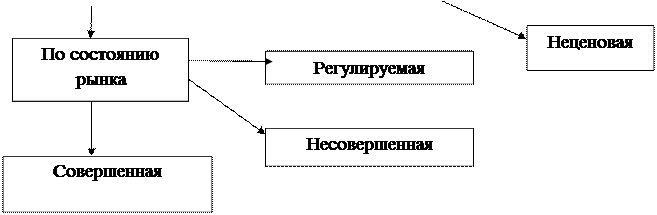 Рис 1. Рыночное соперничество На практике существуют две модели конкуренции: совершенная и несовершенная. Совершенная конкуренция определяется разными авторами по – разному: - жесткая конфликтная состязательность хозяйствующих субъектов, когда ни один из них не в состоянии оказать решающего влияния на общие условия реализации однородного товара на данном рынке; - состязание экономических субъектов на товарном рынке, при котором на один из них не в состоянии оказать решающего влияния на общие условия реализации однородного товара на данном рынке; - вид отраслевого рынка, на котором много фирм продает стандартный товар и ни одна из фирм не имеет достаточно большой доли рынка, чтобы влиять на цену продукта. Цена для каждой фирмы считается заданной рынком. Вход и выход из отрасли свободны; - состязательность большого числа мелких покупателей и продавцов, каждый из которых обладает достаточно полной рыночной информацией, а потому ни один из них не может контролировать рыночный спрос, поставку товара на рынок или цену на него. Продукт стандартный. Барьеров входа-выхода нет. - характеристика рынка, где много фирм продают стандартный товар, и ни одна из них не имеет достаточной доли, чтобы контролировать рынок и цены. В целом как следует из определений, модель совершенной конкуренции характеризуется пятью признаками: 1. Наличие большого числа экономических агентов, продавцов и покупателей. 2. Однородность продаваемой продукции. 3. Ни один из продавцов или покупателей не в состоянии повлиять на рыночную цену. 4. Свободный вход на рынок и выход с него. 5. Максимальная информированность продавцов и покупателей о товарах и ценах. Первые три признака характеризуют чистую конкуренцию. К понятию чистой конкуренции близко понятие работающей конкуренции, которое может быть определено следующими признаками: - крупнейшая фирма производит незначительный объем продаж (покупок) всего рынка; - высокая степень мобильности ресурсов между рынками; - отсутствие или незначительная величина необратимых издержек ( постоянных издержек организации производства); - наличие потенциальных конкурентов. Несовершенная конкуренция определяется следующим образом: 1. Рынок, на котором не соблюдается хотя бы один из признаков совершенной конкуренции; 2. Характеристика рынка, где два или более продавца, обладая некоторым ограниченным контролем над ценой, конкурируют между собой за продажи; 3. Рынки, на которых либо покупатели, либо продавцы принимают в расчет свою способность воздействовать на рыночную цену. Так как модель совершенной конкуренции является теоретической абстракцией, то все реально существующие рынки в той или иной степени не совершенны. В теории выделяют различные виды рынков с совершенной конкуренцией (по степени убывания конкурентности): монополистическая конкуренция, олигополия, монополия. Монополистической конкуренции характерны следующие черты: - продавцы конкурируют, предлагая дифференцированный товар на рынке, куда возможен вход новых продавцов; - тип отраслевого рынка, на котором существует достаточно много продавцов, продающих дифференцированный товар, что позволяет им осуществлять определенный контроль над продажной ценой товара; - на рынке монополистической конкуренции действует относительно большое число продавцов, кажд