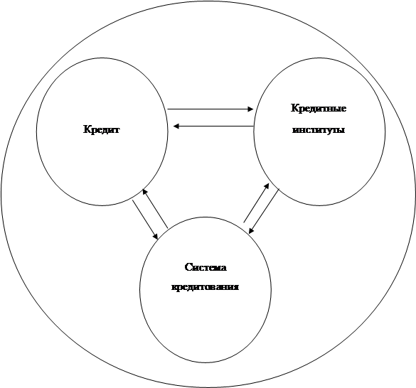 Рисунок -1 Взаимодействие кредитной системы, системы денежно-кредитных институтов и системы кредитования Система кредитования тесно взаимосвязана как с кредитной системой, в том числе с кредитом, его сущностью и функциями, так и с банками, руководствующимися в своей деятельности принципами кредитования. В качестве альтернативного видения взаимосвязи рассматриваемых систем можно дать несколько иное представление: кредитная система как целое включает в себя собственно кредит, кредитные институты и систему кредитования (рисунок -2). Между этими двумя версиями кредитной системы нет противоречия. Если последовательное сцепление блоков системы показывает логику восхождения от общего к частному, то другой рисунок характеризует систему как целое, составленное из определенных частей.