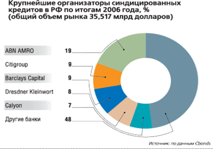 Прирост вкладов физлиц в первом квартале традиционно ниже, чем в четвертом, такая же ситуация и с потребкредитами (в четвертом квартале рост 16%, в первом лишь 8%). Несмотря на абсолютное доминирование на российском рынке синдицированных кредитов, иностранные банки постепенно уходят из этого бизнеса и переориентируются на другие, более доходные и ликвидные финансовые инструменты, такие как секьюритизация и организация выпусков евробондов. Это дает шанс российским банкам занять свою нишу на рынке организации синдицированных кредитов. Рынок синдицированного кредитования продолжает бурно расти. По итогам первого квартала этого года (данные Cbonds) российским заемщикам предоставлено более 30 млрд долларов в виде синдицированных займов. Для сравнения: в прошлом году было выдано около 35,5 млрд долларов, а за 2005–2006 годы — около 65 млрд долларов. «Рост заимствований финансовых учреждений и промышленных компаний вызван замещением старых более дорогих кредитов, диверсификацией источников заемных средств, развитием публичной кредитной истории», — объясняет заместитель председателя правления «АйСиАйСиАй Банка Евразия» Владислав Войцехович. По данным Cbonds, состав лидеров в отрасли организации синдицированного кредитования с прошлого года почти не изменился. Список пяти крупнейших организаторов синдицированных займов, которые занимают 55% всего рынка по итогам первого квартала текущего года, является почти зеркальным отражением аналогичного перечня прошлого года. Единственным новшеством стало то, что в первом квартале 2007 года из списка лидеров вылетел инвестбанк Dresdner Kleinwort, а вместо него появился BNP Paribas, который и занял в прошедшем квартале первое место, выступив организатором синдицированных займов на общую сумму более 4 млрд долларов.