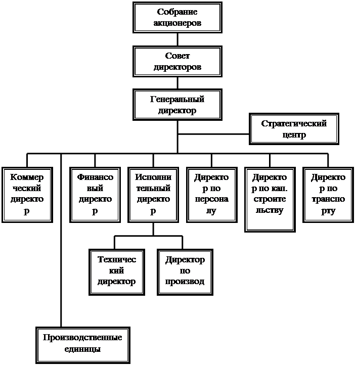 Норматив численности работников аппарата управления Нау на машиностроительных предприятиях определяется по формуле: Нау = 0,213 * Рпп 0,79 * Ф0,16 *Ксм -0,34 (1.3) Где Ксм – коэффициент сменности работы предприятия Нау = 0,213 * 147900,79 * 1272000,16 *1,4-0,34 = 2453 чел. Поскольку в отделах сосредоточено 75 % всех ИТР и служащих, то минимальная численность любого из них должна составлять 10 чел. Для конструкторских и технологических отделов установлена минимальная численность – 21 чел., для прочих бюро – 7 чел., для технических отделов – 16 чел. 1.4 Разработка окончательной организационной структуры системы управления АО “Юнив” Использовав типовую структуру производственного предприятия первой группы и разработав типовые блочные решения, соединим полученные блоки в единую организационную структуру управления АО «Юнив». Сначала был построен линейный аппарат управления, определено количество линейных уровней с низшего к высшему: 1) уровень начальников производственных подразделений; 2) уровень начальников отделов; 3) уровень заместителей главного инженера; 4) уровень заместителей генерального директора АО; 5) уровень коллегиального органа управления – Совета директоров, который принимает крупные по значимости и масштабам действия управленческие решения по всей структуре управления предприятия. Затем по линейным уровням, но уже сверху вниз была установлена функциональная структура управления предприятием. Начиная с высшего уровня было рассмотрено введение каждого подразделения, исходя из объёмов, работ по функциям, масштабов управляемости и нормативов численности. Учитывались также такие исходные данные как тип производства, вид выпускаемой продукции, объёмы потребления ресурсов и выпуска продукции и многие другие. Рационализация проектируемой структуры заключается в том, чтобы повысить эффективность линейно-функциональной системы управления АО путём сокращения дублирования функций в аппарате управления. Необходимо отметить, что при определении наиболее рациональной степени централизации и децентрализации аппарата управления по каждой функции была выявлена необходимость в цеховых бухгалтерских службах, ПДБ, БТК, тех. бюро, т.к. велики размеры производства и численность рабочих в производственных цехах предприятия. Также была посчитана численность ИТР и служащих, необходимой для эффективного управления предприятием по каждой функции, уточнение должностных функций работников. И, наконец, в соответствии с этими разработками и типовой структурой была построена конкретная схема управления АО «Юнив», которая представлена на плакате. В АО “Юнив” было введено собрание акционеров, которое является высшим органом управления, к исключительной компетенции которого относятся такие вопросы, как изменение устава или уставного капитала, избрание членов совета директоров, ревизионной комиссии или прекращение их полномочий, утверждение годовых отчетов и бухгалтерских балансов; образование и досрочное прекращение полномочий исполнительных органов и т. п. В качестве усовершенствования структуры управления АО я ввожу стратегический центр, который подчиняется непосредственно генеральному директору. Он занимается стратегическим планированием, управлением инноваций, системным анализом и программированием. 2. РАЗРАБОТКА ОРГАНИЗАЦИОННОЙ СТРУ