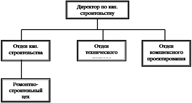 В условиях ПО функции планирования и организации капитального строительства и подразделения, занятые их осуществлением, централизуются только в аппарате управления головного предприятия. Основными факторами, определяющими состав структурных подразделений блока управления капитальным строительством, являются: объем капитальных вложений; объем работ, проводимых хозяйственным и подрядным способами соотношение промышленного и гражданского строительства и т. д. Руководство отделом осуществляет начальник отдела, на которого возложена задача по обеспечению выполнения работ по капитальному строительству и реконструкции предприятия, рациональное использование капитальных вложений и повышение их эффективности. Задачи отдела капитального строительства: - организация, строительство и реконструкция объектов производственного назначения в соответствии с утверждёнными планами, титульными списками и проектно-сметной документацией, обеспечение своевременного ввода в действие новых производственных мощностей; - организация и строительство жилых домов, больниц, ДДУ, объектов социально-бытового назначения, а также содействие кооперативному и индивидуальному жилищному строительству [2] Отделу капитального строительства подчиняется ремонтно-строительный цех, отдел технического надзора, отдел кап. строительства и отдел комплексного проектирования. Организационная структура блока «Управление капитальным строительством» изображена на рисунке 1.8.