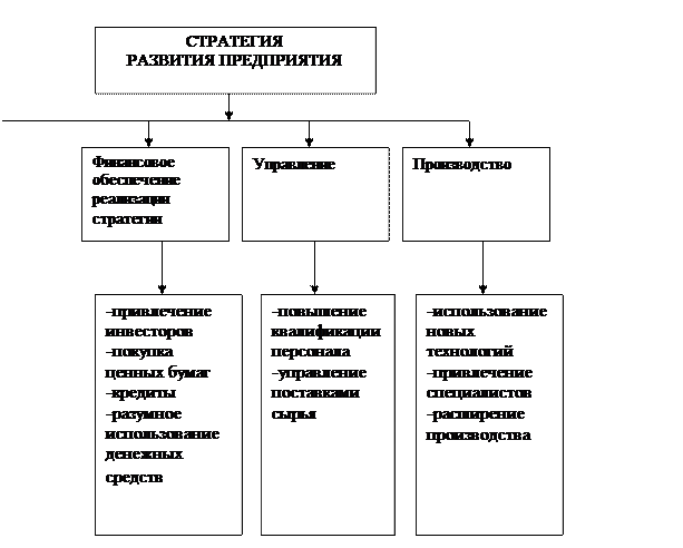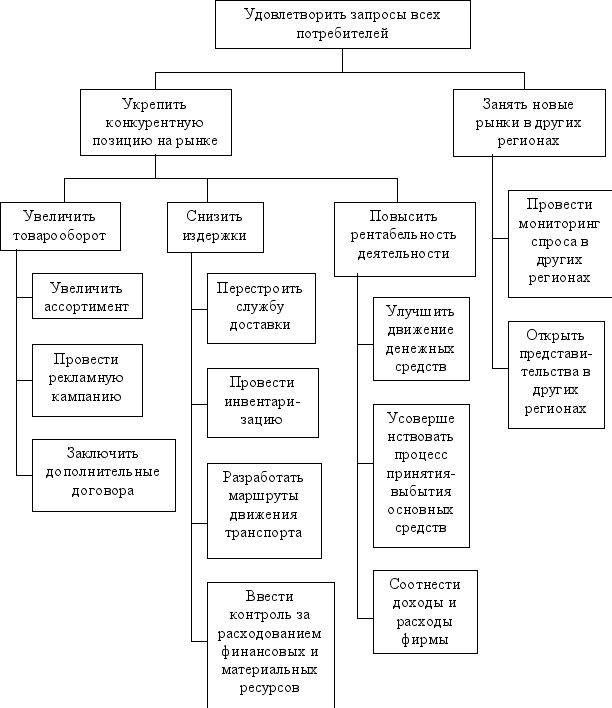 После сопоставления внешних и внутренних угроз и потенциальных возможностей, руководству организации для достижения своих целей необходимо разрабатывать стратегию. Стратегия представляет собой детальный всесторонний комплексный план, предназначенный для того, чтобы обеспечить осуществление миссии организации и достижение целей. Стратеги большей частью формулируются и разрабатываются высшим руководством, но ее реализация предусматривает участие всех уровней управления. Стратегический план должен разрабатываться с точки зрения перспективы всей организации. Он должен обосновываться обширными исследованиями и фактическими данными. Стратегический план придает фирме определенность, индивидуальность, что позволяет ей привлекать определенные типы работников, и в то же время, не привлекать работников других типов. Стратегические планы должны быть разработаны так, чтобы не только оставаться целостными в течении длительных периодов времени, но и быть достаточно гибкими, чтобы при необходимости можно было осуществить их модификацию и переориентацию. Разработка стратегии должна затрагивать все уровни управления предприятия, так как решения, вырабатываемые при стратегическом планировании, имеют отношение ко всем сотрудникам организации. Поэтому необходимо согласование интересов при выработке стратегии. Групповое обсуждение, кроме того, позволяет рассмотреть большое число альтернатив. Но и сходимость при групповом выборе существенно ниже, чем при единоначалии. Поэтому обычно имеет место групповое обсуждение и единоличное принятие окончательного решения Таки образом, рассмотрев возможности компании ЗАО «Мебель-Дизайн», ее слабые и сильные стороны, проведя анализ угроз, исходящих из внешней среды, и ознакомившись с основными принципами выработки стратегии, можно определить стратегию фирмы, при этом опираясь на цели организации. Так как компания работает на развивающемся рынке с сильной конкуренцией, то для нее наилучшей будет комбинированная стратегия, нацеленная на решение своих конкурентных преимуществ и предусматривающая более глубокое проникновение и географическое развитие рынка, с последующей вертикальной интеграцией вверх. Это можно сформулировать следующим образом: · Сначала минимизировать издержки и тем самым укрепить свою конкурентную позицию, при этом освоить продажу в уже имеющихся магазинах сопутствующих товаров (картины, осветительные приборы, покрывала, зеркала и другие предметы дизайна и интерьера · выйти на новые рынки, заключив договора в регионах, затем закрепиться в них, путем покупки существующих торговых мебельных предприятий · в дальнейшем стремиться к приобретению доли акций производящих предприятий. Глава 3. Выбор и обоснование мероприятий по реализации стратегии развития предприятия. 3.1. Построение «дерева целей» стратегии развития предприятия. Этот раздел представлен в виде «дерева целей», так как это приведет к более четкому и наглядному представлению целей фирмы. Формирование «дерева целей» происходит на основе графа, ветви которого отражают основные направления по реализации выбранной стратегии как основы для формирования стратегических целей по функциональным подсистемам. Схема 2. «Дерево целей»