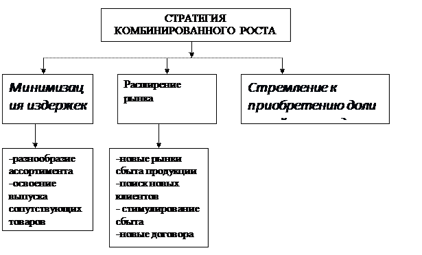 ![]() 3.2. Моделирование процессов принятия решений на основе структурированных задач «дерева целей» по трем классам. Для выбранной стратегии комбинированного роста, можно изобразить следующее «дерево целей»: Схема 3 . «Дерево целей» по стратегии комбинированного роста.