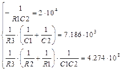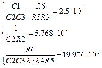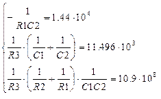 Полагая, что R5=R6=50кОм, С2=2нФ и С1=С3=1нФ рассчитаем R2, R3 и R4.