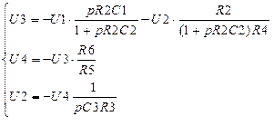 Решая систему уравнений получаем R3=20 кОм, R2=86.685 кОм, R4=12.515 кОм. Для второго звена АВТ R5=R6=60 кОм, С2=3 нФ и С1=С3=1 нФ