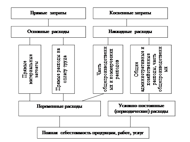 Рис 1. 1. Классификация себестоимости на производство продукции, работ и услуг 7) по отношению к технологическому процессу и функциональному назначению: основные и (обусловленные технологией основного и вспомогательных производств) и накладные (по обслуживанию и управлению производством); К основным затратам относятся неизбежные технологические расходы, непосредственно связанные с изготовлением продукции, например, затраты на сырье, материалы, топливо, энергия на технологические цели, заработная плата производственных рабочих и отчисления на социальное страхование, расходы по содержанию и эксплуатации оборудования. К накладным расходам относятся затраты, связанные с организацией, управлением, технологической подготовкой производства и обслуживанием его (цеховые и общезаводские расходы). 8) по отношению к производству: производственные, непроизводственные (по содержанию непроизводственных подразделений), непроизводственные (недостачи, потери); 9) по связи произведенных затрат с соответствующими отчетными периодами: затраты отчетного, затраты будущего периодов; Под расходами текущего периода понимаются расходы, связанные с производством и реализацией продукции данного периода (включая резервируемые расходы будущих периодов, относимые на себестоимость продукции данного периода). К расходам будущих периодов относятся такие затраты, которые хотя и возникают в данном периоде, не подлежат погашению в следующих отчетных периодах путем отнесения на издержки производства или обращения в течение срока, к которому они относятся, но не более пяти лет. К таким расходам относятся: - по неравномерно произведенному в течение года ремонту основных средств; - взносы арендной платы за последующие периоды; - расходы, связанные с горно-заготовительными работами; - подготовительными к производству работами в сезонных отраслях промышленности; - освоение новых предприятий, производств, установок и агрегатов; - рекультивация земель и другие. Предстоящими являются расходы, включаемые в себестоимость отчетного периода путем резервирования (расходы на оплату отпусков). В зависимости от технологических, организационных и других особенностей выделяют затраты: - по подготовке, осуществлению и совершенствованию производственной деятельности; - по обслуживанию и управлению производств; - по подготовке кадров, оплате труда, созданию санитарно-гигиенических условий труда; - налоги, сбора и отчисления; - не производственные затраты и потери; - прочие. Условно-переменные затраты зависят от объема производства продукции и изменяются прямо пропорционально изменению объема производства, могут носить производственный и непроизводственный характер. Это затраты на приобретение сырья и материалов, технологического топлива и энергии, на основную заработную плату производственных рабочих и т.п. (производственные расходы), транспортные издержки, торгово-комиссионные сборы и другие затраты, которые зависят от величины выручки от реализации продукции (коммерческие расходы). К условно-постоянным относятся затраты, абсолютная величина которых при изменении объема производства изменяется незначительно: - амортизационные отчисления; - зарплата управленческого персонала; - расходы на отопление и освещение помещений, арендная плата, денежные расхо