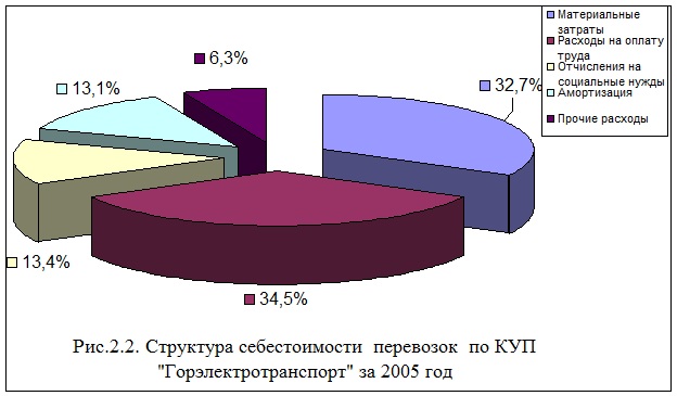 Как видно из табл. 2.3, фактические затраты КУП «Горэлектротранспорт» ниже плановых на 278 млн. руб., или на 1,3 %. Превышение затрат произошло по статье «отчисления на социальные нужды» на 110 млн. руб. и по статье «амортизации» на 152 млн. руб. Рост затрат по статье «амортизация» произошел за счет увеличения стоимости основных средств по причине обновления основных средств. Незначительно изменилась по сравнению с планом в 2006 году и структура затрат: увеличилась доля материальных затрат на 0,2 %, амортизации основных средств и нематериальных активов - на 0,7 %, отчислениям на социальные нужды - на 0,7 %, по остальным статьям доля из в общих расходах снизилась по сравнению с планом. В таблице 2.4 рассмотрены затраты предприятия на перевозку пассажиров в 2005-2006 гг. Анализ затрат на перевозку пассажиров произведен на основании формы № 5 «Отчет о затратах на производство и реализацию продукции (работ, услуг) (Приложение 6,7). Структуру расходов на перевозку пассажиров рассмотрим в табл. 2.4 и на рис. 2.2. и 2.3.. Таблица 2.4 Структу ра расходов на перевозку пассажиров по КУП «Горэлектротранспорт» в 2005-2006 гг.
