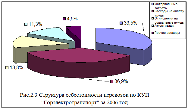 Как видно из табл. 2.2. и рис. 2.1 КУП «Горэлектротранспорт» занимает доминирующее положение на рынке городских пассажирских перевозок. Для сохранения своего положения на рынке транспортных услуг предприятием: -в 2005 году был введен маршрут №3 «Кристалл - Солнечная», который позволил увеличить перевозку пассажиров на 1218,2 тыс. человек; -в июле 2006 года введен маршрут № 18 «Кристалл-Гидроавтоматика», позволяющий увеличить перевозку пассажиров на 406,1 тыс. чел. В 2007 году планируется открыть троллейбусное движение по ул. Мазурова – ул. Хатаевича, что позволит увеличить выпуск троллейбусов на 15 единиц и перевести дополнительно – 3290,9 тыс. чел. Увеличение перевозки пассажиров позволит увеличить удельный вес предприятия в городских пассажирских перевозках на 1,1 п.п. Анализируя приведенные данные, можно сказать, что в целом КУП «Горэлектротранспорт» работало в 2005-2006 годах достаточно стабильно, наращивало объемы выполняемых работ и оказываемых услуг. Все производственные подразделения предприятия выполнили доведенные плановые задания по основным технико-экономическим показателям за 2005-2006 годы. В течение анализируемого периода в организации проводилась работа по созданию здоровых условий труда работающих, регулярно выплачивалась заработная плата. 2.2. Анализ состава, структуры и динамики производственных издержек Систематическое определение и анализ структуры затрат на перевозку пассажиров имеют очень важное значение, в первую очередь для управления затратами на перевозку пассажиров с целью их минимизации. Структура затрат в каждой организации должна анализироваться как в элементном, так и в по статейном разрезе. Структура затрат на производство продукции (работ, услуг) в различных отраслях неодинакова. В зависимости от удельного веса отдельных видов затрат в себестоимости продукции, выделяют соответствующие группы производств. Происходящие изменения в технике, технологии и организации производства отражаются и на количественном соотношении между отдельными видами затрат. Анализ динамики и структуры затрат позволяет выяснить тенденции изменения данного показателя, выполнения плана по его уровню, определить влияние факторов на его прирост, установить источники и дать оценку работы организации по использованию возможностей снижения себестоимости перевозок. Основной классификационной группировкой затрат, используемых в планировании и в учете КУП «Горэлектротранспорт» является группировка расходов по элементам затрат. В табл. 2.3. рассмотрены затраты предприятия на производство продукции в 2006 году по сравнению с планом. Таблица 2.3Выполнение плана по затратам на перевозку пассажиров по КУП «Горэлектротранспорт» в 2006 году