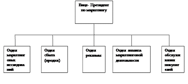 Рисунок 1. Жизненный цикл товара Маркетинговые службы могут представлять собой два уровня управления: центральные маркетинговые службы и оперативные отделы. В общем аппарате управления фирмой центральные маркетинговые службы - координирующие, планирующие и контролирующие органы стратегии производственно- сбытового управления. При этом большинство оперативных вопросов по реализации комплексной рыночной и товарной политики решается на низовом уровне - непосредственными производителями конкретного товара. Структура маркетинговых служб разнообразна. Однако, прослеживая системы линейных и функциональных связей можно выделить следующие основные типы: 1. по функциям маркетинговой деятельности; 2. по продукту; 3. по регионам; 4. по группам потребителей; 5. матричная. В организациях функциональных маркетинговых подразделений каждый отдел или сектор разрабатывает одну или ряд определенных функций маркетинговой деятельности (отдел изучения рынка, отдел рекламы и стимулирования сбыта, отдел каналов товародвижения и т. д.). Такую структуру обычно имеют маркетинговые службы небольших фирм, работающих с узким товарным ассортиментом, на небольшом числе рынков или их сегментах, отличающихся определенной однородностью, стабильностью и относительно незначительной величиной емкости. Как правило это фирмы, производящие неиндивидуализированный товар - товар, который не требует значительных модификаций в зависимости от оттенков предъявляемого к нему спроса, а также не являющийся объектом существенного воздействия научно-технического прогресса, т. е. не требующий значительной модернизации в области НИОКР. Недостатки: · отсутствие специализированных подразделений по продукту, следовательно затрудненность связи и контроля за процессом разработки идей нового товара, его создания, а также внедрения на рынок приводит к замедлению инноваций · из-за отсутствия спецслужб по регионам не учитывается их специфика или возникают трудности со внедрением продукта на определенные рынки затруднено решение вопросов финансирования маркетинговых подразделений. Функциональная организация. Самой распространенной схемой являетсяфункциональная организация службы маркетинга (рисунок 2). В этом случае специалисты по маркетингу руководят разными видами (функциями) маркетинговой деятельности. Они подчиняются вице-президенту по маркетингу, который координирует их работу. Основным достоинством функциональной организации является простота управления. С другой стороны, по мере роста товарного ассортимента и рынков фирмы эта схема все больше и больше теряет свою эффективность. Становится все труднее разрабатывать особые планы для каждого отдельного рынка или товара, а также координировать маркетинговую деятельность фирмы в целом.