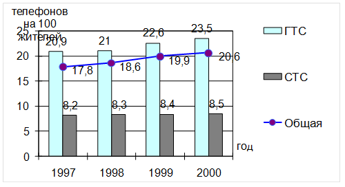 - - - - - - - - - - - 1986 г - 1987 г. - 1993- Подразделения Управления связи Челябинской области (ГТС, телеграф, междугородная станция) вошли в состав созданного открытого акционерного общества "Связьинформ" Челябинской области, которое и стало правопреемником Челябинского областного управления связи. 1.3 Правовое обеспечение деятельности ОАО «Уралсвязьинформ- Челябинск» Открытое акционерное Общество "Уралсвязьинформ" (в дальнейшем именуемое "Общество") учреждено в соответствии с Указом Президента Российской Федерации "Об организационных мерах по преобразованию государственных предприятий, добровольных объединений государственных предприятий в акционерные Общества" от 1 июля 1992г. № 721, а также постановлением Правительства Российской Федерации от 22 декабря 1992г. №1003 "О приватизации предприятий связи". Общество осуществляет свою деятельность в соответствии с Гражданским кодексом Российской Федерации: - Глава 4. ЮРИДИЧЕСКИЕ ЛИЦА Ст. 55. Представительства и филиалы; - Раздел 6 Акционерные общества (Статьи с 96 Основные положения об акционерном обществе по 104. «Реорганизация и ликвидация акционерного общества»); - Глава 39. Возмездное оказание услуг (Статьи с 779. «Договор возмездного оказания услуг» по 783. «Правовое регулирование договора возмездного оказания услуг» ) и Федеральным законом "Об акционерных обществах". ОАО «Уралсвязьинформ- Челябинск» осуществляет свою деятельность на основании нормативных и руководящих документов отрасли, таких как : 1. Эксплуатационные нормы на электрические параметры каналов ТЧ" 2. Эксплуатационные нормы на электрические параметры линейных и сетевых трактов ВСС РФ" 3. Эксплуатационные нормы на электрические параметры цифровых каналов" 4. Правила технической эксплуатации цифровых междугородних и международных тлф станций ВСС РФ 5. ISDN и FRAME Relay технология и практика измерения 6. Правила технической эксплуатации первичных сетей связи ВСС" 7. РД " Основные положения развития ВСС России до 2005 года" 8. Эксплуатационные нормы на электрические параметры коммутируемых каналов сети ТфОП 9. Эксплуатационные нормы на электрические параметры цифровых каналов и трактов ССП 10. РД 45.051-99 "Тех. Эксплуатация СТС 11. Правила оказания услуг телефонной связи в РФ от 26.09.97 12. Автоматизированые системы расчетов с пользователями за услуги электросвязи. Общие технические требования 13. РД 45.120-2000 «Нормы технологического проектирования. Городские и сельские телефонные сети» 14. РД 45.064-99 "Оборудование кабельное оконечное. Общие технические требования 15. РД 45.004-99 «Система показателей качества услуг местной тлф связи» 16. РД 45.005-99 «Система показателей качества услуг местной тлф связи» 17. РД45.056-2000 «Система показателей качества местной телефонной сети (методики расчетов показателей качества для услуги «предоставление местного телефонного соединения»)» И других. 1.4 Технико-экономическая оценка финансово-хозяйственной деятельности Компании. Как уже упоминалось ранее, основным видом деятельности компании является предоставление услуг проводной связи. На рисунке 1.2 показана динамика роста телефонизации Челябинской области.