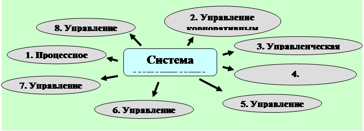 Рис. 4. ISO 9001:2000 как базовая система менеджмента организации и ее подсистемы 1. Систему управления проектами (пункт 7.3 ISO 9001:2000); 2. Систему управления корпоративными знаниями (4.2 ISO 9001:2000); 3. Систему управленческого учета (4.2.4 ISO 9001:2000); 4. Систему стратегического менеджмента (5.3, 5.4, 5.6 ISO 9001:2000); 5. Систему управления рисками (8.5.1, 8.5.2 ISO 9001:2000); 6. Систему управления персоналом (6.2.2 ISO 9001:2000); 7. Систему управления взаимоотношениями с клиентами (7.2 ISO 9001:2000). Для того, чтобы система менеджмента качества ISO 9001:2000 действительно стала основой для построения интегрированной системы менеджмента, необходимо, чтобы требования стандарта распространялись на всю деятельность компании, для чего, возможно, потребуется более широкий взгляд на понятие «качество». Качество можно трактовать как степень соответствия фактической работы организации тому, как эта работа была запланирована (в части соответствия технологиям, оперативным планам, стратегическим планам и т.д.). Это не противоречит классическому определению качества (степени, с которой совокупность собственных характеристик продукции соответствует требованиям), поскольку требования всех заинтересованных сторон отражаются в том, как организация планирует собственную деятельность. Таким образом, автоматически любой процесс организации, любая деятельность попадает в систему менеджмента качества, и цель функционирования этой системы – увеличение степени соответствия, и улучшение самих «планов» становится очевидной и затрагивает все аспекты управления компанией (финансовые, маркетинговые и т.д.), а понятия «система менеджмента качества» и просто «система менеджмента» становятся взаимозаменяемыми. Таблица 1 Вербальная модель интеграции систем менеджмента