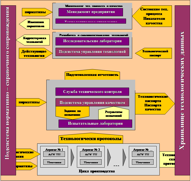 Рис. 5. Концептуальная схема интегрированной корпоративной информационной системы. 4. Специальный вопрос.Концепция реинжиниринга корпоративных информационных системДля поддержания операционной деятельности любое промышленное предприятие развивает свою информационную инфраструктуру. Поскольку рыночная ситуация требует от предприятия быстрой и точной реакции на происходящие изменения, актуальной становится задача совершенствования существующих производственных процессов (то есть последовательности логически связанных процедур, имеющей несколько входов и выходов и предназначенной для получения заданного конечного результата) с целью: - минимизации потерь на предприятии; - повышения прибыли; - снижения себестоимости и т.д. Для достижения этих целей первостепенное значение имеют: - качественные системы количественного учета; - АСУ технологических установок как источники первичных данных; - аналитические инструменты для принятия решений. По факту уже сейчас на любом предприятии используются автоматизированные системы управления предприятием, технологическими процессами (АСУП, АСУТП), учетные системы, мало взаимодействующие между собой. Какими бы функциональными особенностями не обладали указанные локальные системы, они не включены в единый производственный цикл. Успех комплексной задачи управления, в целом, должен строится на технологии с двумя контурами управления. Первый контур является оперативным и включает производственные процессы для контроля показателей эффективности процесса производства. Второй контур , содержащий бизнес-процессы, предназначен для периодического анализа и повышения эффективности производственных процессов. В комплексной системе должны функционировать оба контура. Ситуации, когда присутствуют некоторые из этих контуров управления, не являются эффективными. Основные принципы создания систем управления производством: Принцип 1 : Информация – это один из основных ресурсов предприятия, поэтому необходима организация информации как промышленного ресурса. Данные могут и должны рассматриваться и управляться в качестве корпоративного ресурса, используемого как между предприятиями, так и внутри предприятий по цехам. Объединение данных в единый ресурс и предоставление средств их совместного использования повысит эффективность управления компанией. Системы автоматизации постоянно совершенствуются с учетом имеющихся требований, изменяется структура управления, уточняются и перераспределяются функции подразделений. Однако все эти изменения не должны коренным образом затрагивать основы информационной системы – инфраструктуру и базы данных. Принцип 2 : При создании системы УП предприятия необходимо следовать корпоративным стандартам в области использования базового программного обеспечения для отраслевых предприятий и международным стандартам на инструментальные средства и технологии интеграции подсистем автоматизации. Принцип 3 : Независимость базовых основ информационной системы от изменений организационной структуры компании/предприятия. Соблюдение данного принципа позволяет сохранить инвестиции, вложенные в информационные технологии. Для реорганизации предприятия необходимо провести предпроектное обследование. Под предпроектным обследованием поним