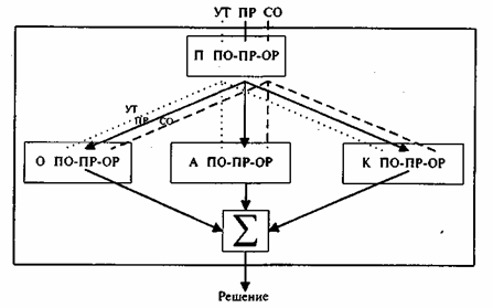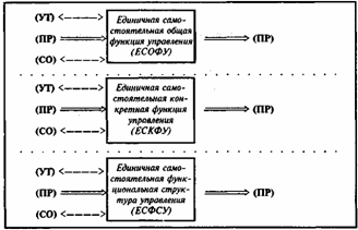 Формирование функциональной структуры из типовых звеньев дает хорошиерезультаты для небольших организаций где число функций управления непревышает 200. При увеличении их числа сложность функциональных структурсущественно возрастает. Поэтому для организаций со значительно большим числомфункций предлагается метод агрегирования в рамках единичной самостоятельнойконкретной функции управления (ЕСКФУ). Таким образом, мы подходим к понятиюзвена ЕСКФУ.На основании соотношения (2.3) и статуса типового звена звено ЕСКФУпредставляет сочетание типовых звеньев, реализующих общие функции управления.Еще раз отметим, что планирование играет ведущую роль среди общих функцийуправления. Схема взаимодействия ТИПОБЬ[Х звеньев в рамках эвена ЕСКФУ сучетом преобразования процедур приведена на рис. 2.9. Она замыкает внутрисебя большую часть связей и в конечном счете приводится к рассмотренному вышевиду типового эвена (рис. 2.6).Поясним этот процесс более подробно. Процедура принятия решения в звене«П»(планирование) является исходной для функционирования остальных звеньев.Процедуры утверждения решения (УТ) и согласования (СО) в звеньях«0»(организация), «А»(активизация) и «К»(контроль) входят в состав процедурподготовки решения (ПО) и организации выполнения решения (ОР) соответственно.С учетом схем типового звена (рис. 2.3) и их взаимодействия составим условноеобозначение звена ЕСКФУ (рис. 2.5.1). Звено ЕСКФУ Рис. 2.5. Схема взаимодействия типовых фумсционатных звеньев при образовании звена ЕСКФУ (П, О, А, К - типовые звенья, реализующие общие функции - планирование, организацию, активизацию и контроль) Рис. 2.5.1 Условное обозначение эвена ЕСКФУ Общий вид звена ЕСКФУ идентичен звену ЕСОФУ. Таким образом, все наширассуждения привели к однообразию в представлении однотипных понятий.Понятие звена ЕСКФУ также отличается от понятия звена управления или элементаструктуры управления. Звено ЕСКФУ отражает только соответствующий наборединичных самостоятельных общих функций управления.Для малого предприятия, выполняющего принятый ранее набор конкретных функцийуправления, функциональная схема управления (ФСУ) будет иметь следующий вид(рис. 2.5.2).Взаимосвязь звеньев ЕСКФУ в рамках организации образует функциональнуюструктуру управления (ФСУ) более высокого уровня, чем ФСУ общих Рис. 2.5.2 Схема взаимодействия ЕСКФУ при образовании ФСУ МП 99 функций. ФСУ, составленная из ЕСКФУ, является базой для формированияорганизационных структур управления (ОСУ) организаций.Набор ЕСКФУ в рамках малого предприятия (рис. 2.5.2) формирует единичнуюсамостоятельную функциональную структуру управления (ЕСФСУ).Исходя из изложенного общая схема составляющих функциональной структурыуправления любой организации может быть представлена в следующем виде (рис.2.6). Рис. 2.13 Составляющие общей ФСУ организации Однако только в случае составления ФСУ организации из ЕСФСУ полностьюреализуется важнейший закон организации (композиции пропорциональности),рассмотренный в гл. 4. Он формулируется так: «Каждая материальная системастремится сохранить в своей структуре все необходимые элементы (композицию),находящиеся в заданном подчинении (пропорции)». Например, организация ООО«Риэлтер-2» состоит из четырех человек и занимается посредническимиоперациями с жилыми помещениями. Анализ э