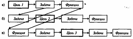 (рис. 2а).Функции (подфункции) — виды конкретных работ. Например, из цели «поднятьпроизводительность труда» вытекает ряд конкретных задач, в частности, заменитьстанок А на станок Б. Из этой задачи вытекает набор функций (или поручений),например, экономисту Иванову К.В. за три дня составить калькуляцию затрат назамену станка, рабочему Петрова А.Н. на четвертый день заменить станок,электрику Сидорову В. К. подключить силовой кабель к станку и т.д.Если какая-либо задача из набора нереализуема (технически, экономически ит.д.), то приоритет переходит к ней (рис. 2б), при этом цель 1 должна бытьскорректирована до цели 2 и далее вновь приоритет переходит к цели. Есликакая-либо функция из набора нереализуема, то приоритет переходит к ней (рис.2в), при этом должна быть скорректирована соответствующая задача из прежнегонабора и сама цель до цели 3, далее вновь приоритет переходит к цели.