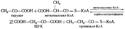 Образовавшаяся пропионовая кислота выводится из процесса и накапливается вне клетки. Сукцинил-КоА превращается в метилмалонил-КоА: