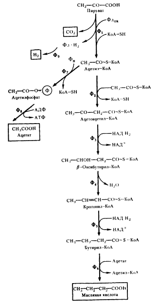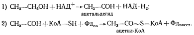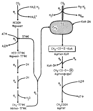 Однако ни одна из этих реакций не приводит к синтезу АТФ. Энергетическая сторона процесса долгое время оставалась неясной. Оказалось, что получение энергии связано с образованием молекулярного водорода в процессе окисления этанола, дегидрирование которого на двух этапах приводит к синтезу ацетил-КоА: