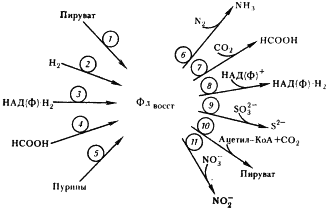 Объясняется это тем, что у клостридиев (как и других облигатных анаэробов) физиологические реакции в клетке всегда протекают при отрицательных окислительно-восстановительных потенциалах. В этих условиях FeS-белки, имеющие общий отрицательный окислительно-восстановительный потенциал, особенно пригодны для функционирования в составе ферментов и в качестве переносчиков электронов. Образующийся в реакции восстановленный ферредоксин поставляет электроны для восстановления N2 , протонов (H+ ), CO2 и НАДФ+ , а последующее превращение ацетил-КоА приводит к синтезу АТФ в реакции субстратного фосфорилирования. Путь, ведущий к синтезу масляной кислоты, начинается с реакции конденсации двух молекул ацетил-КоА (см. рис. 57). Образовавшийся ацетоацетил-КоА восстанавливается в b-оксибутирил-КоА. Источником электронов в этой реакции и дальше на пути синтеза масляной кислоты служат молекулы НАДxH2 , образующиеся при окислении 3-ФГА в 1,3-ФГК (см. рис. 53). Дальнейшее превращение заключается в отщеплении от молекулы (3-оксибутирил-КоА молекулы воды, что приводит к образованию соединения с двойной углеродной связью. Кротонил-КоА ферментативно восстанавливается в бутирил-КоА. Масляная кислота образуется в реакции переноса кофермента А с молекулы бутирил-КоА на ацетат. Эта реакция более "выгодна" для клетки, так как не приводит к потере энергии (в отличие от реакции простого гидролиза). Образующийся в реакции ацетил-КоА возвращается в метаболический поток и может быть использован для синтеза АТФ (реакция 7 на рис. 57) или же вновь участвовать в последовательности реакций, ведущих к синтезу масляной кислоты (реакции 2 — 6, там же). Разобранный выше путь, завершающийся синтезом масляной кислоты, не связан с получением клеткой энергии, поскольку ни на одном из этапов не происходит образования АТФ. Единственное назначение метаболических превращений ацетил-КоА по этому пути — акцептирование электронов, переносимых на НАД+ в процессе гликолитического метаболизирования глюкозы: две молекулы НАД-H2 образуются на этапе гликолиза, и на двух этапах превращений ацетил-КоА до масляной кислоты происходит потребление водорода с НАД-H2 . В связи с этим особо важное значение приобретает превращение ацетил-КоА, ведущее к синтезу ацетата, поскольку именно с этим путем связано дополнительное получение клостридиями энергии в процессе маслянокислого брожения. Процесс включает несколько ферментативных реакций (см. рис. 57). Сначала имеет место окислительное декарбоксилирование пировиноградной кислоты, катализируемое пируват:ферредоксиноксидоредуктазой. Далее с помощью гидрогеназы происходит выделение молекулярного водорода с восстановленного ферредоксина. Гидрогеназы — одна из групп FeS-содержащих ферментов, катализирующих реакции поглощения и выделения молекулярного водорода, обнаружены у разных групп эубактерий: облигатных анаэробов и аэробов, факультативных форм, у хемо- и фототрофных организмов. Различаются строением молекулы, природой доноров и акцепторов электронов, с которыми взаимодействуют, локализацией в клетке, выполняемыми функциями. Но все гидрогеназы катализируют реакцию H2 ® 2H+ + 2e– . Гидрогеназа C. pasteurianum , один из наиболее детально изученных ферментов, — белок с молекулярной массой примерно 60 000 Да, представленный одной субъединицей. В молекуле с