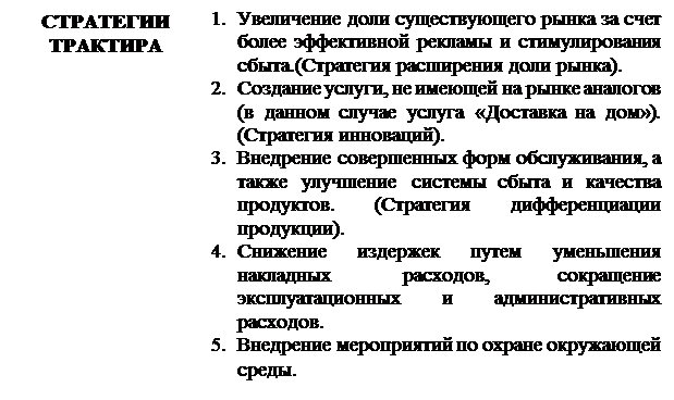Если мы изменим нашу цену на услуги (трактир «Кружка»), то есть мы ее снизим на 10%, то наши конкуренты вынуждены будут снизить цены: кафе «Днем и ночью» - на 5%, а кафе «Емеля» - на 10%, при этом им придется увеличить расходы на рекламу соответственно: на 10% и на 12%; им также придется улучшить качество соответственно: на 5% и на 5%. Если мы увеличим расходы на рекламу на 10%, то «Днем и ночью» снизит свои цены на 2%, а «Емеля» - на 5%.Им придется увеличить расходы на рекламу соответственно на 5% «Днем и ночью» и на 5% «Емеля» и улучшить качество услуг «Днем и ночью» на 2%, «Емеля» на 3%. Если мы улучшим качество услуг на 10%, то «Днем и ночью» снизит цену на 10%, а «Емеля» - на 15%.Они увеличат расходы на рекламу «Днем и ночью» на 2%, «Емеля» на 2%. Кроме того, они попытаются улучшить качество услуг соответственно «Днем и ночью» на 10%, «Емеля» на 10%. 2.1. Стратегический план маркетинга
