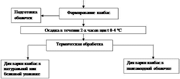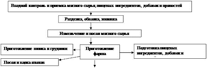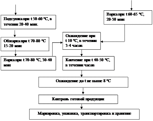 Данные стандарты являются общими и отражают порядок функционирования КС УКП на предприятии без учета его специфических особенностей. Специальные стандарты предприятия представлены в Приложении Ж. Перечисленные стандарты являются специальными, так как разработаны в соответствии с особенностями данного предприятия. Каждому стандарту соответствует та или иная функция КС УКП. Последняя функция включает в себя основные виды контроля качества продукции: входной контроль, текущий контроль и контроль готовой продукции. Входной контроль. Целью входного контроля является обеспечение производства сырьем, основными и вспомогательными материалами в соответствии с требованиями нормативно – технической документации. Контроль качества поступившего скота по категориям, упитанности и жировой массе осуществляют приемщики скота предубойного содержания скота, а проверку сопроводительных документов и клинический осмотр поголовья ведут ветеринарные врачи. Контроль качества поступившего мяса и мясопродуктов, вспомогательных материалов, а также сырья проводит лаборатория мясокомбината. После того как перечисленная продукция поступит на склад, кладовщик должен немедленно сообщить об этом работникам лаборатории и ветеринарным врачам. Если продукция не проходит испытания на органолептические показатели (вид, запах, цвет, и др.), то в лаборатории инженер – химик и инженер – биолог делают анализы на микробиологические и физико-химические показатели (проверяется 10% от партии того или иного сырья или материалов). Ответственность за правильное размещение и хранение поступивших материалов несет начальник холодильного цеха. Контроль технологических процессов и качества труда работников. Данный вид контроля направлен на проверку соблюдения рабочими технологических инструкций, инструкций по технике безопасности и санитарное состояние рабочих мест. Обнаруженные недостатки должны разбираться с рабочими непосредственно на рабочих местах. Все замечания по ходу проверки должны быть рассмотрены непосредственно с рабочими и мастерами участка. По результатам контроля составляется акт и направляется начальнику цеха, который должен немедленно устранить недостатки, составить мероприятия по улучшению качества продукции. Контроль над устранением обнаруженных недостатков осуществляет гл. технолог. Контроль готовой продукции. Для контроля готовой продукции формируется дегустационная группа, которая может состоять из любых работников мясокомбината. В процессе дегустации продукция проверяется на органолептические показатели (вкус, вид, запах и др.), если выпущенная продукция не проходит данную проверку, то в лаборатории делаются физико-химические и микробиологические показатели. Один раз в 10 дней готовая продукция проверяется на наличие массовой доли соли, нитрита, влаги, жира, белка и др. Документация, которая соответствует тому или иному виду контроля представлена в Приложении З. Каждому виду сырья, а также всем основным и вспомогательным материалам соответствует определенный ГОСТ. Каждому виду готовой продукции соответствуют как ГОСТы, так и ТУ. Рассмотрим, как осуществляются данные виды контроля в КС УКП на примере приготовления варено-копченых колбас, который представлен на рис. 1.