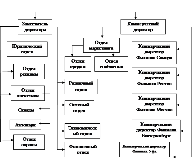 Рис. 7. Организационная структура «BM corporation» В последние семь лет приоритетным направлением считается оптовая торговля. Первый оптовый центр, под названием «БауЦентр», был открыт в Самаре в 1999 году. А в 2004 г. организовали ещё один филиал оптово-розничной торговли в г. Уфе с аналогичным названием. Филиал «БауЦентр»-Уфа официально начал свою работу 02 апреля 2004 г. Предметом деятельности уфимского филиала «БауЦентр» является оптово-розничная торговля отделочными материалами. Рассмотрим организационную структуру уфимского филиала «БауЦентр». В ней можно выделить следующие звенья: коммерческий директор филиала, исполнительный директор, отдел учета, бухгалтерия, отдел продаж, заведующие складами и грузчики (см. рис. 8).