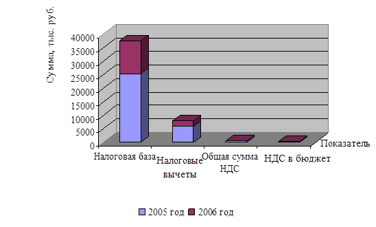 Далее проведем сравнение данных по исчислению НДС за два рассматриваемых года (рисунок 4). Из таблицы 4 видим, что в течение анализируемого периода произошли следующие изменения: налогооблагаемая база к 2006 году уменьшилась на 13404587 рублей, вследствие, чего сумма исчисленного НДС уменьшилась на 2848619 рублей. А также сумма налоговых вычетов в 2006 году по отношению к 2005 году уменьшилась на 3650311рублей, общая сумма НДС, исчисленная к уменьшению в 2005 году составила 533870 рублей, а в 2006 году составила 0 рублей, вследствие этих изменений сумма НДС подлежащая перечислению в бюджет значительно увеличилась в 2006 году. Данные рисунка 4 свидетельствуют о том, что все из рассматриваемых показателей в 2005 году значительно превышают аналогичные показатели в 2006 году.