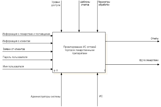 Рис. 3.1 – Контекстная диаграмма модели ИС предприятия оптовой торговли лекарственными препаратами. Вход представляет собой информацию, преобразуемую функциональным блоком. Для данной модели входной информацией являются данные о лекарствах и поставщиках, клиентах, заявки от клиентов. Управляющим механизмом является уровни доступа, шаблоны отчетов, параметры обработки. Исполняющим механизмами является информационная система и администратор ИС. В качестве выходной информации служат отчеты продаж и БД по лекарствам. 3.2 Построение диаграмм IDEF 0 Процесс проектирования ИС для обработки заявки от клиента состоит из трех этапов: «Авторизация и аутентификация пользователя», «Заполнение БД», «Обработка данных» (рис. 3.2).