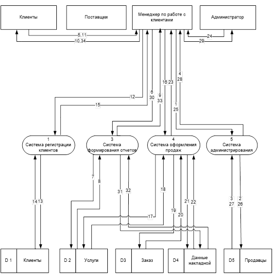 Запрос на проверку прав доступа к программе: 1. Запрос менеджера по работе с клиентами в систему администрирования на проверку прав доступа к программе. 2. Запрос системой администрирования в таблицу "Продавцы" на проверку правильности пароля. 3. Информация из таблицы "Продавцы" в систему администрирования о правильности пароля. 4. Информация менеджеру по работе с клиентами из системы администрирования о правах доступа к программе. Запрос на предоставление прайс-листа: 5. Запрос от клиента менеджеру по работе с клиентами на предоставление прайс-листа. 6. Запрос менеджера по работе с клиентами в систему формирования отчетов на предоставление прайс-листа. 7. Запрос системой формирования отчетов в таблицу "Услуги" на формирование прайс-листа. 8. Информация из таблицы "Услуги" в систему формирования отчетов о прайс-листе. 9. Информация менеджеру по работе с клиентами о прайс-листе. 10. Прайс-лист клиенту. Запрос на оформление покупки. 11. Запрос клиента менеджеру по работе с клиентами на оформление покупки. 12. Запрос менеджера по работе с клиентами в систему регистрации клиентов на сохранение информации. 13. Запрос системой регистрации клиентов в таблицу "Клиенты" на сохранение информации. 14. Информация из таблицы "Клиенты" в систему регистрации клиентов о сохранении данных о клиенте. 15. Информации менеджеру по работе с клиентами из системы регистрации клиентов о сохранении данных о клиенте. 16. Запрос менеджера по работе с клиентами в систему оформления продаж на оформление заказа. 17. Запрос системой оформления продаж в таблицу "Услуги" на изменение количества услуги. 18. Информация из таблицы "Услуги" в систему оформления продаж о изменении количества услуги. 19. Запрос системой оформления продаж в таблицу "Заказ" на сохранение информации о заказе. 20. Информация из таблицы "Заказ" в систему оформления продаж о сохранении информации о заказе. 21. Запрос системой оформления продаж в таблицу "Данные накладной" на сохранение информации о накладной. 22. Информация из таблицы "Данные накладной" в систему оформления продаж о сохранении информации. 23. Информация менеджеру по работе с клиентами об оформлении заказа. Запрос на изменение пароля. 24. Запрос от администратора менеджеру по работе с клиентами на изменение пароля. 25. Запрос менеджера по работе с клиентами в систему администрирования на изменение пароля. 26. Запрос системой администрирования в таблицу "Продавцы" на изменение пароля. 27. Информация из таблицы "Продавцы" в систему администрирования о изменении пароля. 28. Информация из системы администрирования менеджеру по работе с клиентами о изменении пароля. 29. Информация администратору об изменении пароля. Запрос на получение накладной. 30. Запрос менеджера по работе с клиентами в систему формирования отчетов на получение накладной. 31. Запрос системой администрирования в таблицу "Данные накладной" на получение накладной. 32. Информация в систему формирования отчетов о накладной. 33. Информация менеджеру по работе с клиентами о накладной. 34. Накладная клиенту. Приложение 5