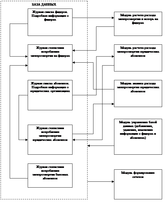 Рисунок 1.1 - Схема одного из фидеров (ТП - трансформаторная подстанция; ПУ - прибор учета электроэнергии). Инженер пофидерного анализа ежедневно получает информацию в виде актов от инспекторов о проделанной работе на фидерах и ведет ежедневный учет, а в конце месяца составляет итоговый отчет. Данными учетно-отчетной документации пофидерного анализа являются: Наименование фидера; № счетчика фидера; коэффициент счетчика фидера; предыдущие показания фидера; настоящие показания фидера; расход электроэнергии на фидере (разность предыдущих и настоящих показаний); расход оплаченной электроэнергии всех юридических и бытовых абонентов на фидере; процент потерь электроэнергии (неоплаченной) на фидере; наименование юридического абонента; адрес; телефон; наименование фидера, на котором находится абонент; номер счетчика абонента; коэффициент счетчика абонента; предыдущие показания абонента; настоящие (текущие) показания абонента; дата контрольного съема (контрольный съем - показания, снятые у абонента в средине отчетного периода); среднесуточный расход (рассчитывается на основе контрольного съема) предполагаемый расход абонента за месяц; расход по отчету абонента; разность (потери) от предполагаемого расхода и расхода по отчету абонента; расход электроэнергии бытовых потребителей по фидерам. 2. Разработка информационного обеспечения автоматизированной системы2.1 Разработка структурной схемы программыЭтап проектирования структуры программы заключается в разработке детальной схемы будущей программы, на которой указываются классы, их свойства и методы, а также различные взаимосвязи между ними. На основе анализа предметной области и формулировки требования осуществляется определение функций, которые должна выполнять разрабатываемая программа, а также концептуализация предметной области. Структурная схема определяет функциональные возможности программного продукта. Структурная схема программы ведения учетно-отчетной документации пофидерного анализа изображена на рисунке 2.1
