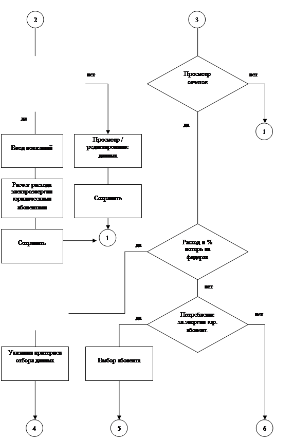 Рисунок 3.2 - Алгоритм работы подсистем " Работа с базой данных фидеров" и "Учет потребления электроэнергии на фидерах". При работе с базой данных фидеров необходимо иметь возможность выбора нужного фидера из существующей базы данных для просмотра его данных или их изменения. Также необходимо реализовать возможность на основании введенных данных расчет расхода электроэнергии на фидере и расчет процента потерь электроэнергии. На рисунке 3.3 показан алгоритм работы подсистемы "Работа с базой данных юридических абонентов". Рисунок 3.3 - Алгоритм работы подсистемы "Работа с базой данных юридических абонентов".