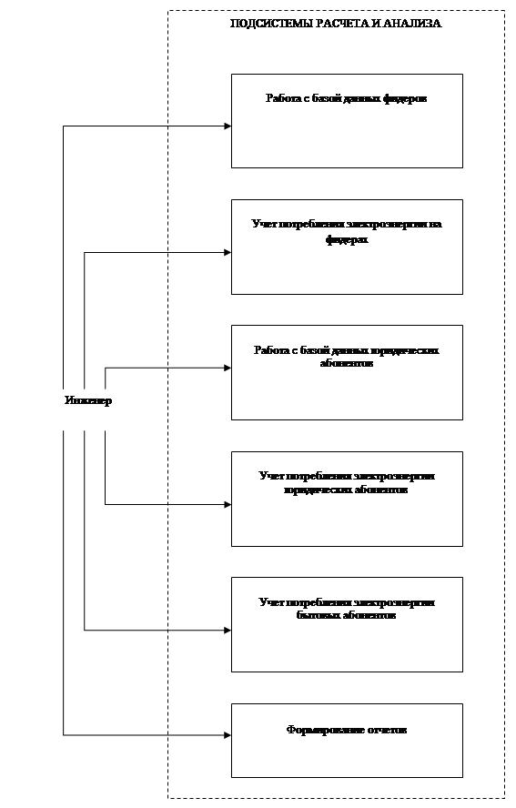 Рисунок 3.1 - Подсистемы расчета и анализа Как видно из приведенных выше подсистем расчета и анализа программа должна выполнять следующие функции: вести базу данных фидеров; вести базу данных юридических организаций; вести учет потребления электроэнергии на фидерах; вести учет потребления электроэнергии юридических абонентов; вести учет потребления электроэнергии бытовых абонентов; формировать отчеты. Для более детального анализа возможностей программы построим алгоритмы работы каждой подсистемы. На рисунке 3.2 показан алгоритм работы подсистемы "Работа с базой данных фидеров" и "Учет потребления электроэнергии на фидерах".