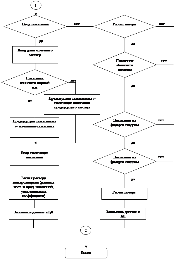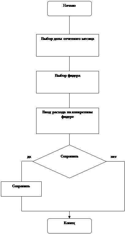Рисунок 2.1 - Структурная схема программы ведения учетно-отчетной документации пофидерного анализа. Блоки представленные на рисунке 2.1 выполняют следующие функции: Модуль расчета расхода электроэнергии и потерь на фидерах определяет текущий расход, т.е. разницу от настоящих и предыдущих показаний, суммирует расход оплаченной электроэнергии всех юридических и бытовых абонентов на фидере и, исходя из этих данных, рассчитывает процент потерь электроэнергии (неоплаченной электроэнергии) на фидере. Модуль расчета расхода электроэнергии юридических абонентов сравнивает текущие показания с предыдущими показаниями каждого абонента и определяет разницу, т. е текущий расход. Модуль анализа расхода электроэнергии юридических абонентов на основе промежуточного контрольного съема выполняет расчет среднесуточного потребления и расчет предполагаемого расхода электроэнергии за месяц. А также - расчет разности предполагаемого расхода и текущего расхода. Модуль формирования отчетов позволяет формировать отчет расхода электроэнергии за месяц юридических абонентов, отчет расхода и процент потерь электроэнергии за месяц на фидерах, просматривать информацию об абонентах. Журнал списка фидеров отображает информацию о наименовании фидеров; номера счетчиков, установленных на фидерах; ежемесячные показания электроэнергии на фидерах. Журнал списка юридических абонентов содержит наименования организаций, их адреса, телефоны и названия фидеров, на которых расположены данные организации. Журнал статистики потребления электроэнергии юридических абонентов содержит данные для расчетов: показания (контрольного съема, предыдущие и настоящие); номер и коэффициент счетчика. А также - данные расчетов среднесуточного потребления электроэнергии, предполагаемого расхода электроэнергии за месяц, текущего расхода и разности предыдущего и текущего расходов электроэнергии. Журнал статистики потребления электроэнергии бытовых абонентов содержит данные о потреблении электроэнергии бытовыми потребителями на фидерах. 2.2 Разработка алгоритма программыАлгоритм программы ведения учетно-отчетной документации пофидерного анализа изображен на рисунке 2.2