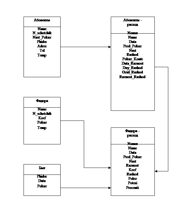 Итак, спроектировано 5 таблиц базы данных. Для удобства работы две из них следует проиндексировать. Таблицу "Phider- Rashod" - по полю Name и Data. Индекс по полю Data необходим для фильтрации записей в таблице по дате отчетного месяца. Индекс по полю Name применяется для фильтрации записей по наименованию фидера. Таблицу "Abonent_Pashod" - по полю Nast для определения записей, которые содержат показания контрольного съема и не содержат данных о показаниях по отчету, и по полям Name и Data. Связи между таблицами показаны на рисунке 3.7.