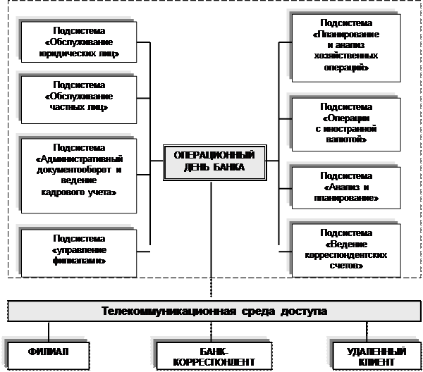 Автоматизация банковских технологий в новых рыночных условиях стала складываться в начале 1990-х годов, когда появились коммерческие банки. На рынке программных средств появляется ряд фирм-разработчиков, ведущие из них: «Инверсия », «Диасофт », «Асофт », «Програмбанк », «R - Style » и др. Развитие процесса автоматизации привело к предложению разнообразных банковских систем, что обусловлено не столько множеством фирм-разработчиков, но и различием самих банков по выполняемым функциям, структуре, размерам и технологии банковского дела. Создание и функционирование автоматизированных банковских технологий основывается на системотехнических принципах, отражающих важнейшие положения теоретической базы, которая включает ряд смежных научных дисциплин и направлений. К ним относятся экономическая кибернетика, общая теория систем, теория информации, экономико-математическое моделирование банковских ситуаций и процессов, анализ и принятие решений. Банковские технологии как инструмент поддержки и развития банковского бизнеса создаются на базе ряда основополагающих принципов: - комплексный подход в охвате широкого спектра банковских функций с их полной интеграцией; - модульный принцип построения, позволяющий легко конфигурировать системы под конкретный заказ с последующим наращиванием; - открытость технологий, способных взаимодействовать с различными внешними системами (системы телекоммуникации, финансового анализа и др.), обеспечивать выбор программно-технической платформы и переносимость ее на другие аппаратные средства; - гибкость настройки модулей банковской системы и адаптация их к потребностям и условиям конкретного банка; - масштабируемость, предусматривающая расширение и усложнение функциональных модулей системы по мере развития бизнес-процессов (например, поддержка работы филиалов и отделений банка, углубление анализа и т.д.); - многопользовательский доступ к данным в реальном времени и реализация функций в едином информационном пространстве; - моделирование банка и его бизнес-процессов, возможность алгоритмических настроек бизнес-процессов; - непрерывное развитие и совершенствование системы на основе ее реинжиниринга бизнес-процессов. Создание или выбор автоматизированных банковских систем (АБС) связаны с планированием всей системной инфраструктуры информационной технологии банка. Под инфраструктурой АБС понимается совокупность, соотношение и содержательное наполнение отдельных составляющих процесса автоматизации банковских технологий . В инфраструктуре кроме концептуальных подходов выделяются обеспечивающие и функциональные подсистемы. К обеспечивающим относят: информационное обеспечение, техническое оснащение, системы связи и коммуникации, программные средства, системы безопасности, защиты и надежности и др. Функциональные подсистемы реализуют банковские услуги, бизнес-процессы и любые комплексы задач, отражающие содержательную или предметную направленность банковской деятельности. Создание автоматизированных банковских технологий помимо общесистемных (системотехнических) принципов требует учета особенностей структуры, специфики и объемов банковской деятельности. Другой характерной особенностью банковских технологий является многообразие и сложность видов обеспечения автома