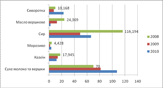 Рис. 3.2. Динаміка експорту молочних продуктів з України за 2008-2010рр.. в натуральному виражені, тис. т