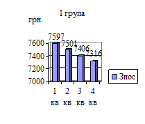 Рис. 2.1. Динаміка зносу по групах основних фондів на ЛОК "Ялинка" за 2006 рік Оскільки нарахування зносу по основним фондам груп 1, згідно податкового законодавства здійснюється окремо по кожному об’єкту цієї групи, то для отримання більш наочної інформації по сумі нарахованого зносу на об’єкти групи 1 основних фондів розглянемо рис.2.2