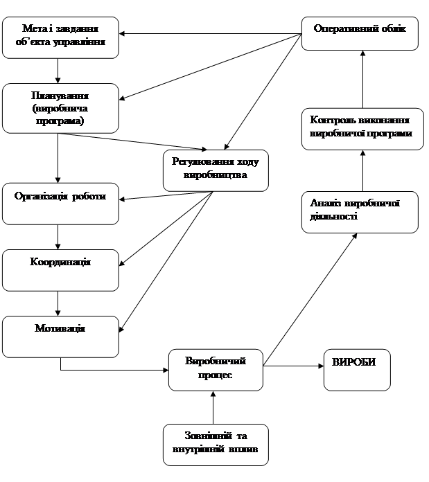 Рис. 1.3. Схема циклу управління виробництвом. Щоб професійно управляти організаційно-обслуговуючою системою у цілому і відповідно збутовою діяльністю закладу ресторанного господарства зокрема керівнику необхідна система управління, яка вирішує певне коло завдань, використовуючи при цьому певні інструменти управління. Головними завданнями управління є: • розвиток концепції збутової діяльності; • структура організації збуту і обслуговування споживачів; • функціонування організації збуту і процесу обслуговування; • подальший розвиток організації збуту і обслуговування споживачів Концепція збуту містить основні рішення відносно сфери діяльності, а також довгострокові цілі та стратегічний порядок дій на ринку. Згідно з концепцією створюється і реалізується на практиці структура організації збуту і обслуговування споживачів закладі ресторанного господарства. Очолює цю структуру на заступник директора (комерційний директор, начальник відділу). До її складу можуть входити: інженер-технолог, економіст з менеджменту, спеціаліст з маркетингу, метрдотель (адміністратор залу), товарознавець. Для забезпечення ефективності роботи цієї структури необхідно постійно дбати про її удосконалення і розвиток. Основними інструментами управління є: - система планування і моделювання процесів; - система виконання (контроль, регулювання, стимулювання); - інформаційна (комунікаційна) система. Приведення їх у дію можливе завдяки реалізації основних функцій управління. Основні функції управління збутовою діяльністю і організацією процесу обслуговування об'єднуються у три групи: функції планування; функції організації; функції контролю і регулювання. Функція планування включає: • збирання інформації про потреби, режим праці і відпочинку • аналіз і оцінку кон'юнктури ринку; • формування асортименту продукції та послуг згідно з вимогами і • розробку перспективних, поточних і оперативних планів випуску і • вибір каналів розподілу і руху продукції; • моделювання оптимальних варіантів систем обслуговування • планування рекламних кампаній і розробка заходів щодо стимулювання збуту; • складання плану витрат на здійснення збутової діяльності й організацію процесу обслуговування споживачів закладу ресторанного господарства. Реалізація функції організації дозволяє комплексно вирішити наступні питання: - організації продажу продукції і обслуговування споживачів закладу ресторанного господарства; - організації додаткових каналів розподілу і руху готової продукції - організації взаємодії всіх підрозділів підприємства для досягнення - організації підготовки персоналу торгової групи та залу і управління їх діяльністю; - організації експедиції для зберігання готової продукції та напівфабрикатів, що у подальшому надходять в інші закладу ресторанного господарствадля подальшої переробки чи реалізації. До функцій контролю і регулювання належать: • контроль за здійсненням збутової діяльності і процесом обслуговування споживачів закладу ресторанного господарства; • оперативне регулювання збутової діяльності і процесу обслуговування споживачів у підприємстві громадського харчування з урахуванням впливу зовнішніх і внутрішніх факторів; • оцінка і стимулювання діяльності збутового апарату; • контроль за виконанням пла