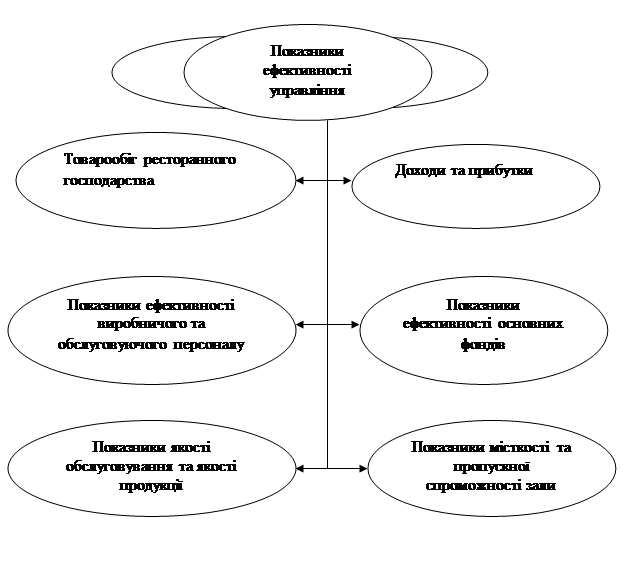 Рис. 1.4. Фактори й змінні зовнішнього й внутрішнього середовища організації. Використання різних підходів до аналізу виробничого менеджменту дозволяє більш глибоко пізнати єдність зовнішнього й внутрішнього середовища підприємства. Так, відповідно до ситуаційного підходу до керування, організаційна структура підприємства і її елементи є не що інше, як відповідь на різні по своїй природі впливу ззовні. Головним фактором при такому підході виступає ситуація, тобто конкретний набір обставин, які впливають на роботу організації в даний період часу. Звідси випливає визнання важливості специфічних прийомів, що допомагають виділяти факторів, впливаючи на які можна ефективно досягти мети. 1.3.Показники ефективності управління торговельно-виробничою діяльністю закладів ресторанного господарства Перед тим як вести мову про ефективність торгово-виробничої діяльності закладів ресторанного господарства визначимо поняття ефективності. Воно передбачає співставлення витрат і результатів. Головним завданням апарату управління є активна дія на керований об’єкт , маючи на меті покращення показників його управління. В залежності від призначення системи і умов її функціонування критеріями ефективності можуть бути різні показники. Критерій ефективності – це показник, що виражає головну міру бажаного результату, яка враховується при розгляді варіантів рішення. Зрозуміло, що критерії ефективності багатообразні і їх не можна звести до одного показника. Розглянемо критерії ефективності, що стосуються об’єкту управління. Загальний критерій - економічні результати діяльності керованої системи в цілому, тобто досягнення підприємством своєї місії при найменших затратах. Група локальних критеріїв: - мінімізація витрат живої праці на виробництво продукції та виконання послуг; - економія витрат матеріальних ресурсів; - покращення використання основних фондів; - мінімізація витрат обігу; - прискорення обертання оборотних фондів. Група якісних показників: - високий рівень технічного оснащення підприємства; - умови праці, які знижують втомлюваність працівників; - виконання замовлень, домовленостей в короткий час при незначних затратах; - висока якість послуг та продукції при витратах в межах норми; - стабільність персоналу при виконанні інших показників; - екологічна чистота. З точки зору функціонуваня суб’єкта управління, тобто самої управляючої системи, критеріями економічної ефективності можуть бути такі, як – швидкий збір необхідної інформації для прийняття управлінських рішень, спроможність прийняти оптимальне рішення в короткий час, оперативність доведення рішень до виконавців, забезпечення чіткого виконання рішень, комплексний контроль за виконанням задачі. Відповідно всі ці критерії повинні бути відображені в певній системі показників економічної ефективності, що й було зроблено відповідно до торгово-виробничої діяльності закладу ресторанного господарства. Розглядаючи ефективність управління торгово-виробничою діяльністю визначимо ряд показників.