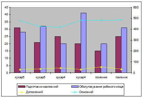 Рис. 2.2 Завантаженість робітників виробництва ресторану «Кратер» згідно елементів витрат часу за досліджувані дні. Розглядаючи завантаженість вдалося виявити, що більш трудомісткою є робота кухаря 5розряду на 1 зміні порівняно з 2, де найбільша результативність спостерігається у кухаря 4розряду. Особливістю є те, що кухар на 1 зміні працює повні 11 годин, в той час як кухар на іншій зміні на годину менше. Для того, щоб мати повне уявлення про завантаженість цих працівників нижче наведено діаграми, які характеризують виробничі витрати часу по елементах.