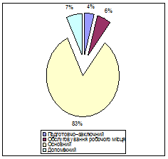 Рис. 2.3 Виробничі витрати часу кухарів п’ятого розряду першої та другої зміни відповідно. Таким чином, вдалося у відсотковому вираженні визначити, що кухар першої зміни витрачає більше основного часу на виробництво потреби, незначну частину на допоміжні та інші потреби під час виробничого процесу. Про те, як виявилося частка основного виробничого часу в працівників другої зміни вище, що відображено на наступній діаграмі і складає відповідно 0,85-0,87 на другій зміні проти 0,85-0,86 на першій зміні.