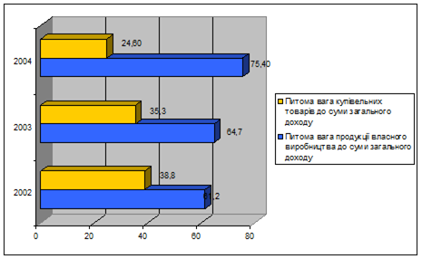 Рис 2.5 динаміка зміни доходу від реалізації ресторану «Кратер» в 2002-2004 роках. Також було розглянуто окремо складові товарообігу – товарообіг по продукції власного виробництва та по купівельним товарам. Показник товарообігу по продукції власного виробництва відображений зростанням, що свідчить про позитивні тенденції в розвитку закладу ресторанного господарства, при чому товарообіг по купівельним товарам зменшується. Важливо звернути увагу на те, що відбулися зміни щодо питомої частки цих показників в сумі загального товарообігу. Це відображено наступними величинами – товарообіг по ПВВ збільшився на 463,47 тис.грн. за досліджуваний період, що відображено темпом зростання на 53,81%. При чому порівнюючи зі збільшенням суми загального товарообігу, то можна визначити, що сума приросту товарообігу по ПВВ більше на 113,81 тис.грн., що підтверджує збільшення його питомої частки на 14,2% в 2004 році порівняно з 2002 роком. Ці величини підтверджують доцільність обраної керівництвом стратегії розвитку для даного закладу. Для більшої наочності динаміку товарообігу по продукції власного виробництва та по купівельним товарам у вартісному вигляді та в питомих частках до загального товарообігу зображено на наступних малюнках.