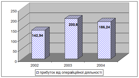 Рис. 2.11 Динаміка рівня витрат ресторану «Кратер» в 2002-2004 роках. Діяльність закладів ресторанного господарства повинна приносити прибуток, який є кінцевою метою і рухаючим мотивом розвитку закладу. З однієї сторони прибуток характеризує ефективну діяльність, є економічним показником росту закладу, а як кількісний показник являє собою різницю між доходами та витратами. Свої економічні інтереси ресторан задовольняє після сплати податків. Отже, за рахунок цього прибутку вирішуються виробничі і соціальні проблеми розвитку. Аналіз прибутку ресторану «Кратер» не дає можливості говорити про чітку тенденцію до зменшення чи збільшення. Розглянувши показник в динаміці за 2002-2004 роки можна стверджувати про збільшення прибутку на 43,3 тис.грн. в 2004 році порівняно з базовим роком, проте порівняно з 2003 роком прибуток зменшився на 14,56 тис.грн., що наочно можна спостерігати на наступному рисунку.