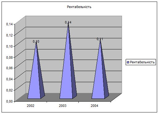 Рис.2.12 Динаміка прибутку ресторану «Кратер» в 2002-2004 роках. Для оцінки ефективності закладу недостатньо аналізу показника прибутку оскільки наявність прибутку ще не означає, що заклад працює ефективно. Абсолютна величина прибутку не дозволяє стверджувати про дохідність закладу. В цьому відношенні для оцінки ефективності роботи закладу влучним буде використовувати показник рентабельності, який характеризує ефективність роботи закладу харчування в умовах ринку та сприяє підвищенню його фінансової стійкості. Рентабельність це відносний показник. Він характеризує відсоткове відношення суми прибутку до таких показників, як товарообіг та валовий дохід. Роль і значення показника рентабельності полягає у наступному: - Цей показник являється одним із критеріїв оцінки ефективності роботи закладу; - Рентабельність – результативний якісний показник діяльності; - Збільшення показника рентабельності забезпечує успіх закладу харчування в конкурентній боротьбі. Рентабельність ресторану «Кратер» за три роки відображена значними коливаннями. В 2004 році рентабельність в цілому збільшилась - на 0,1 порівняно з базовим показником, але щодо 2003 року спостерігається значне зменшення рентабельності, що відображено відношенням 0,14 проти 0,11. Для більшої наочності вказаних показників, їхню динаміку показано на наступному малюнку.