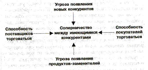 Рис.1 – Пять конкурентных сил (по М.Портеру) М.Портер говорит: «Значение каждой из пяти сил меняется от бизнеса к бизнесу и в конечном счете предопределяет его прибыльность. В тех случаях, когда действие этих сил складывается благоприятно, ...многочисленные конкуренты могут получать высокие прибыли от вложенного капитала. В бизнесах, где одна или несколько сил действуют неблагоприятно, ...очень немногим фирмам удается долго сохранять высокие прибыли». И далее он продолжает: «Пять сил конкуренции определяют прибыльность бизнеса потому, что они влияют на цены, которые могут диктовать фирмы, на расходы, которые им приходится нести, и на размеры капиталовложений, необходимые для того, чтобы конкурировать в этой отрасли»[7С.52]. В самом деле, поставщики и покупатели, которые умеют торговаться, отстаивая свои собственные интересы, способны существенно снизить прибыль организаций, с которыми они вступают в коммерческие отношения. Угроза появления новых конкурентов и продуктов-заменителей влияет на привлекательность бизнеса и работает на снижение его прибыльности. В то же время усиление конкуренции между участниками данного бизнеса снижает общий уровень прибыльности, так как для сохранения своей конкурентоспособности каждая организация-конкурент должна осуществить дополнительные затраты (на качество торговли и послепродажного сервиса, на рекламу и т.д.). Следует также учитывать то обстоятельство, что конкретные значения каждой из пяти упомянутых сил, определяющих конкуренцию в бизнесе, зависят от конкретного ситуационного сочетания ключевых экономических, технологических и других факторов, характеризующих текущую конъюнктуру в данном бизнесе. Конкретную рыночную позицию организации в конкурентной борьбе определяют ее конкурентные преимущества. Конкурентные преимущества — это те характеристики, которые создают для производящей и (или) реализующей данный продукт организации определенное превосходство над ее конкурентами. Эти характеристики могут быть самыми различными и относиться как к самому продукту-товару (или другой базовой услуге), так и к дополнительным. Учитывая, что главным субъектом рыночной среды является покупатель, можно также говорить наряду с конкурентными преимуществами организации о конкурентных преимуществах продукта, под которыми понимаются заключенные в продукте ценности для покупателя, побуждающие этот продукт купить. Пути достижения конкурентных преимуществ — это любые инновации, дающие приращение бизнес-успеха. По М.Портеру, конкурентные преимущества делятся на два вида[7С.53]: 1) дифференциация продуктов-товаров, 2) более низкие издержки на создание и реализацию товаров. Низкие издержки отражают способность фирмы разрабатывать, выпускать и продавать сравнимый товар с затратами меньшими, чем у конкурентов. Дифференциация, по М.Портеру, — это способность обеспечить покупателя уникальной и большей ценностью в виде нового качества товара, особых потребительских свойств или послепродажного обслуживания. Конкурентные преимущества на основе лишь уровня издержек, как правило, не так стойки, как преимущества на основе дифференциации. Например, дешевая рабочая сила (т.е. уменьшение издержек на заработную плату) является преимуществом низкого ранга. Конкурентными преимуществами более высоко